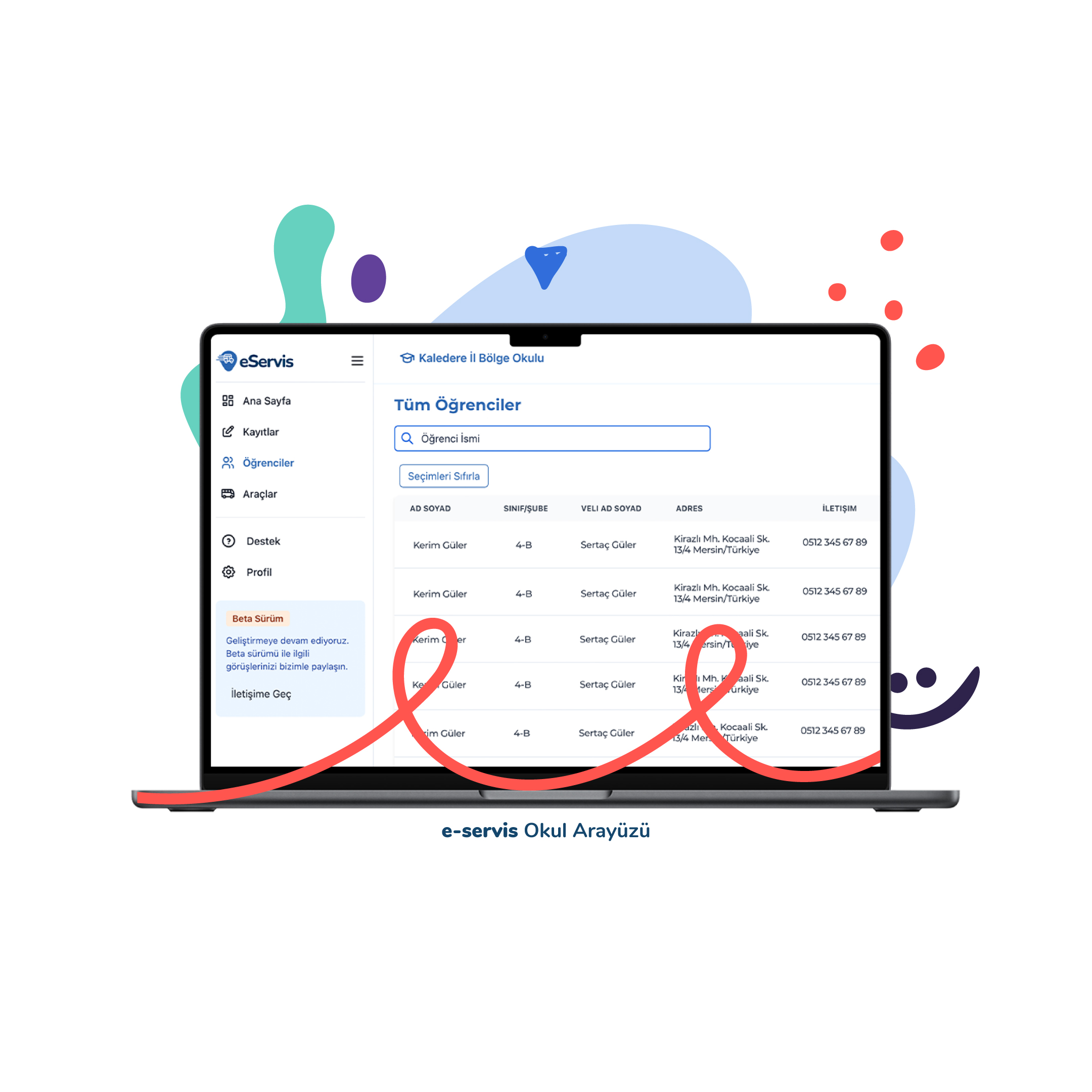 eServis ile servis firmaları, öğrenci taşımacılığında araçlarını anlık veya geçmişe yönelik olarak takip edebilir. Güçlü sistemimiz sayesinde, araçlarınızın nerede olduğunu ve geçmişteki rotalarını kolayca gözlemleyebilir, detaylı raporlar alabilirsiniz. Teknoloji kullanarak hizmetlerinizi daha etkin ve verimli bir şekilde yönetin, eServis ile servis taşımacılığında öncü olun!"
